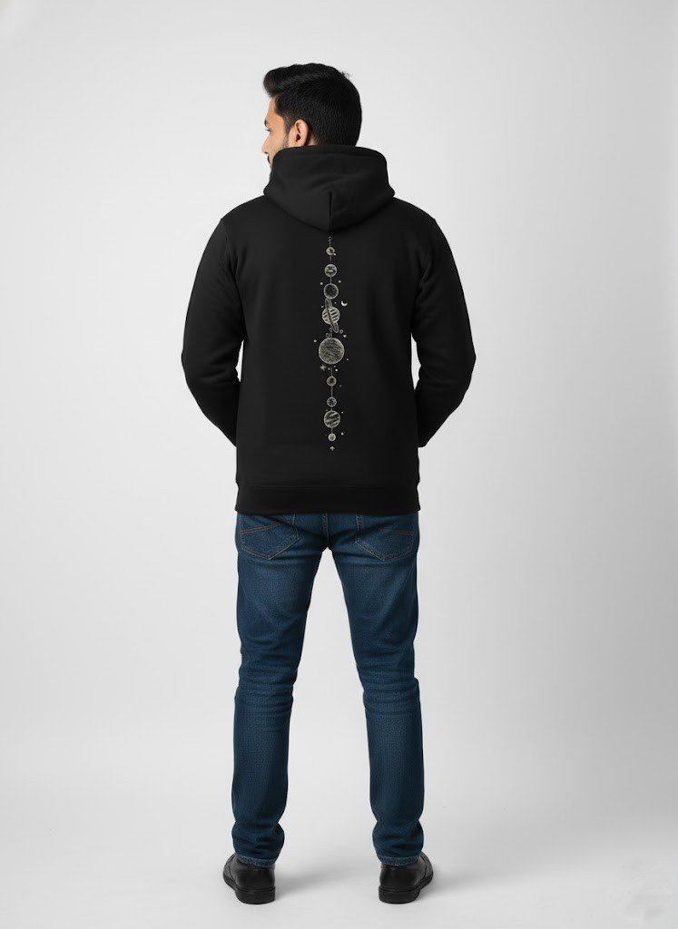 Step into cosmic style with the Celestial Orbit Black Hoodie. Featuring a stunning back print of planets and celestial elements arranged in a vertical alignment, this hoodie blends artistry with comfort. Crafted from premium material, it ensures warmth and a soft touch, perfect for chilly days or stylish layering. Elevate your everyday look with this unique space-inspired design, tailored for both comfort and individuality.